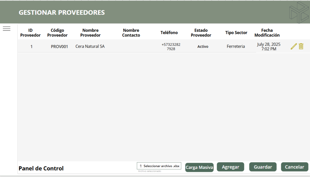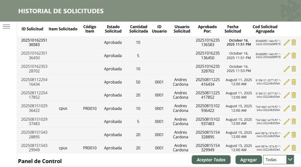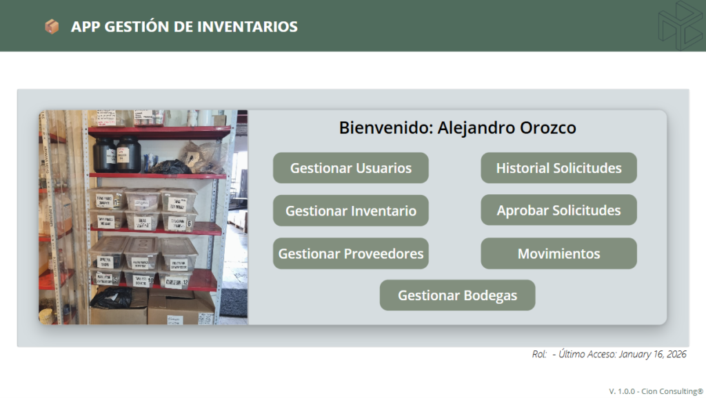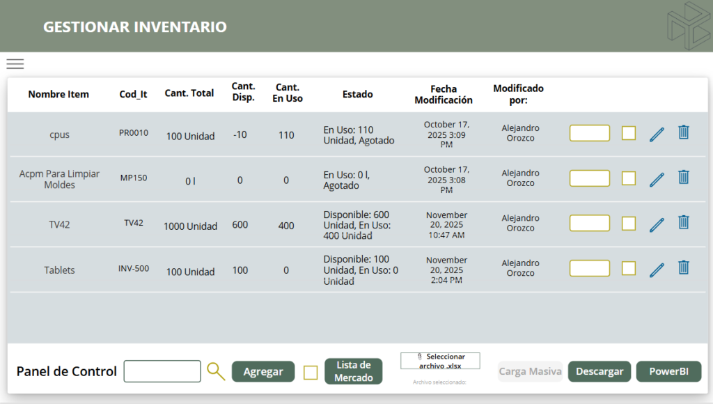 Módulo que permite administrar y monitorear en tiempo real las existencias, disponibilidad y uso de cada ítem del inventario. Facilita el control de stock, identificación de faltantes, actualización de movimientos y trazabilidad de modificaciones, garantizando una gestión eficiente, precisa y alineada a las necesidades operativas.